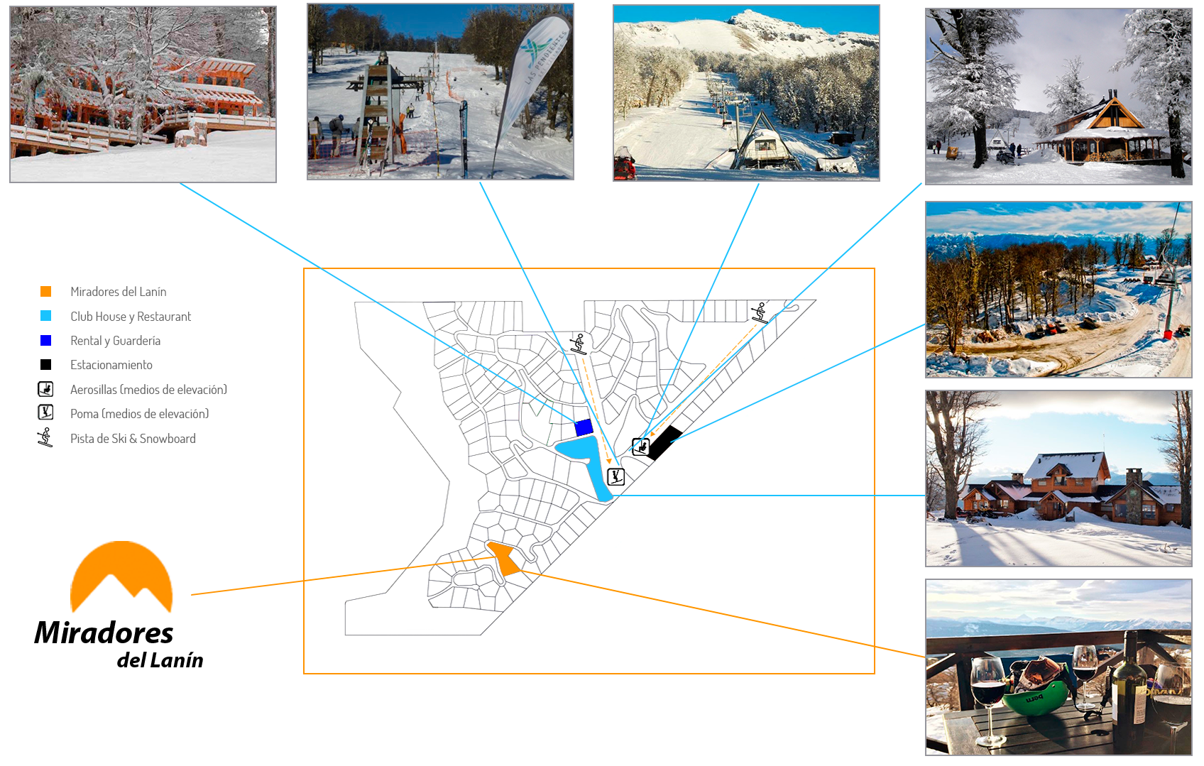 Está localizado en el Ski Village Las Pendientes, (180 lotes distribuídos según su funcionalidad, con superficies mínimas de 2.500 m2 y máximas de 10.000 m2).